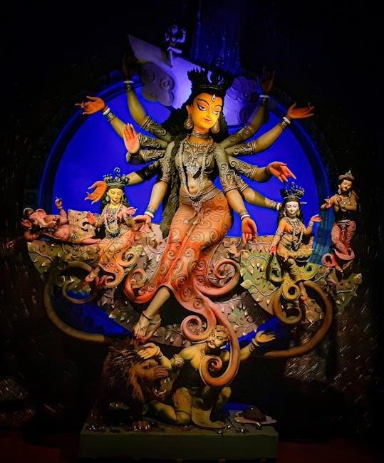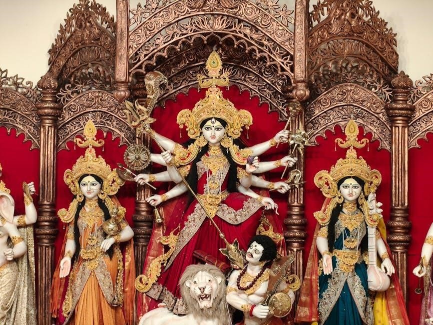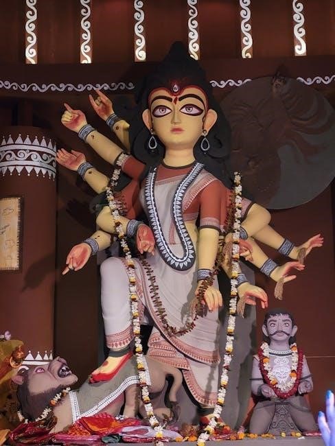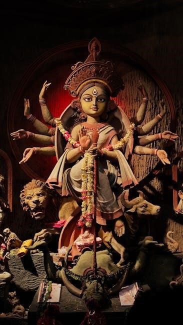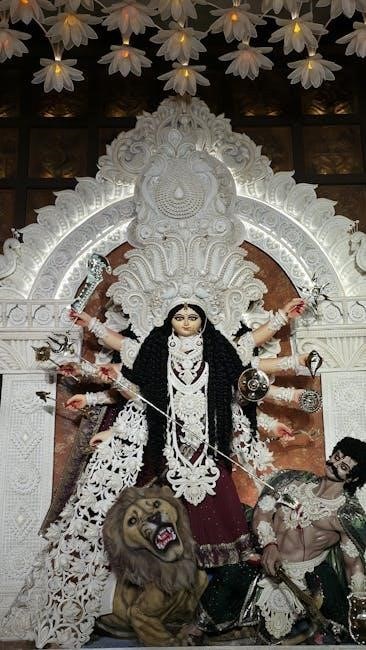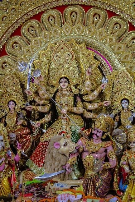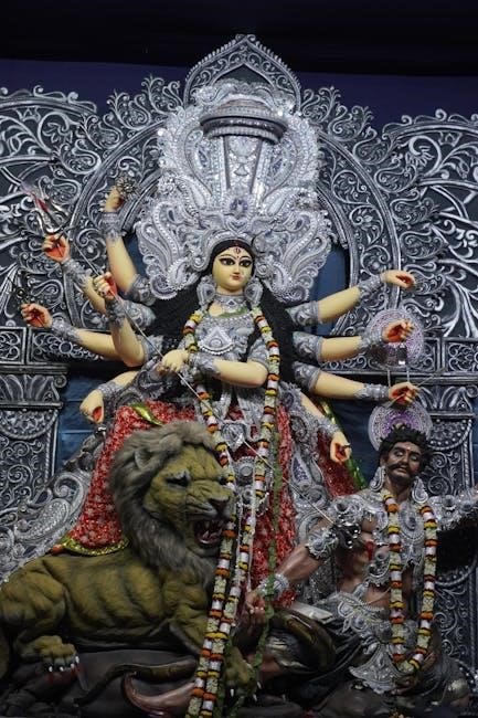 Mahishasura Mardini Stotram holds a pivotal role in Durga Puja, a festival celebrating Goddess Durga’s triumph over Mahishasura. The hymn is chanted during rituals to invoke her divine energy and blessings. It embodies the essence of Devi Mahatmyam, symbolizing the victory of good over evil. During Puja ceremonies, devotees recite the stotram to seek strength, protection, and spiritual enlightenment. Its verses resonate through pandals and temples, creating an atmosphere of devotion and unity. The stotram is also integral to the morning rituals, known as “Bodhan,” marking the awakening of the goddess. Its recitation is believed to purify the environment and infuse participants with divine grace, making it a cornerstone of Durga Puja celebrations.